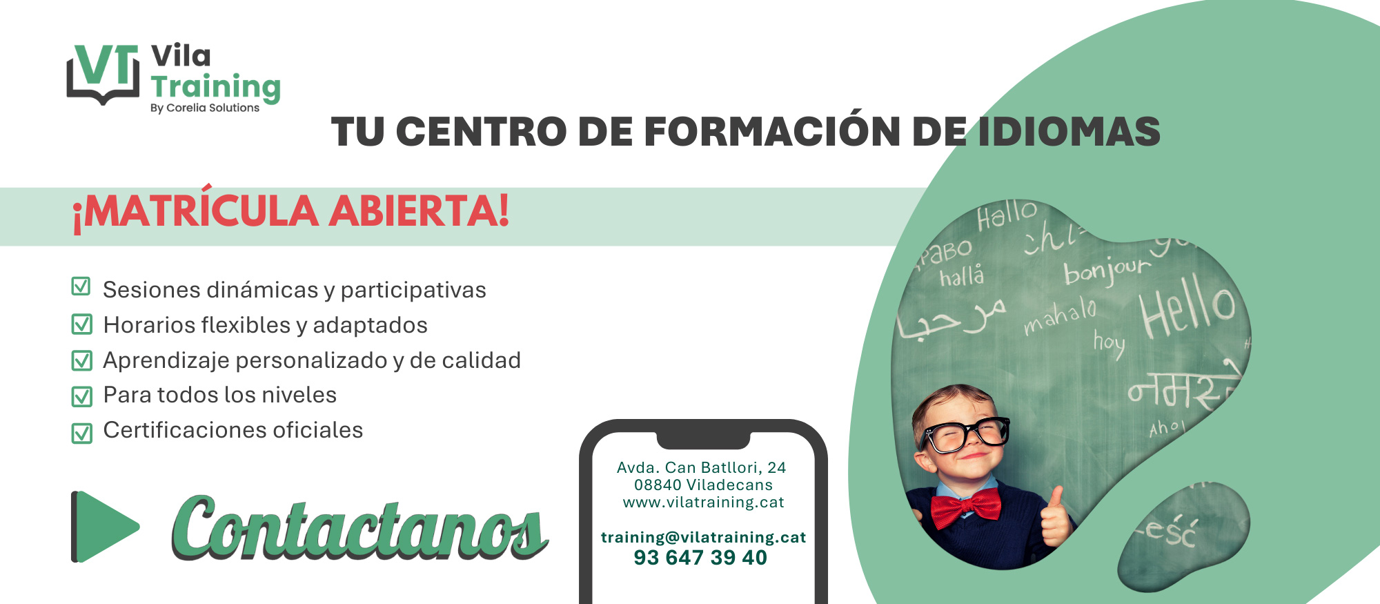 Diseñados para ofrecerte la mejor formación en idiomas, tecnología, IA, marketing y ventas, con la flexibilidad de aprender desde cualquier lugar y en cualquier momento. ¡Inscríbete ahora y empieza a potenciar tu carrera con VilaTraining OnLive!»